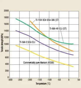 Neither commercially pure titanium nor titanium alloys become brittle even at extremely low temperatures. In particular, commercially pure titanium and Ti-5AI-2.5Sn ELI can be used even at 4.2 K (-269°C)